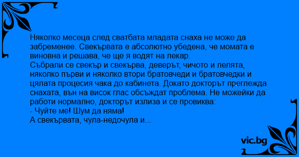 А свекървата, чула-недочула и убедена във вината на снахата, коментира: