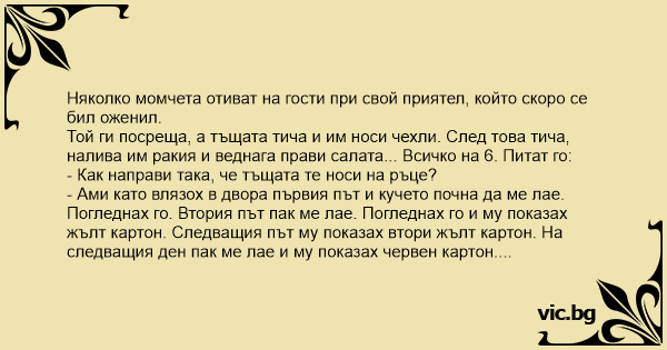 - Ами като влязох в двора първия път и кучето почна да ме лае. Погледнах го. Втория път пак ме лае. Погледнах го и му показах жълт картон. Следващия път му показах втори жълт картон. На следващия ден пак ме лае и му показах червен картон. Извадих пистолета и го застрелях. Е, тъщата вече има два жълти картона...