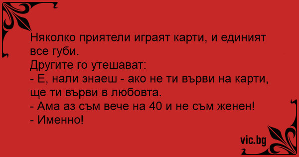 - Е, нали знаеш - ако не ти върви на карти, ще ти върви в любовта.