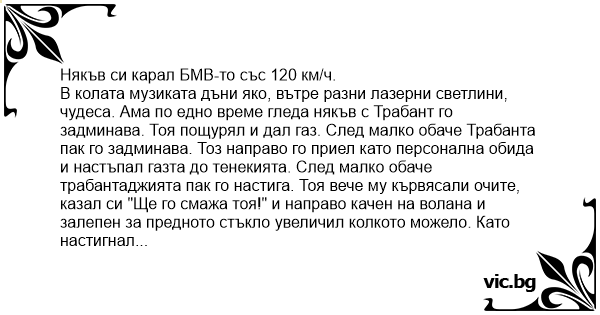 В колата музиката дъни яко, вътре разни лазерни светлини, чудеса. Ама по едно време гледа някъв с Трабант го задминава. Тоя пощурял и дал газ. След малко обаче Трабанта пак го задминава. Тоз направо го приел като персонална обида и настъпал газта до тенекията. След малко обаче трабантаджията пак го настига. Тоя вече му кървясали очите, казал си "Ще го смажа тоя!" и направо качен на волана и залепен за предното стъкло увеличил колкото можело. Като настигнал трабанта ми изревал: