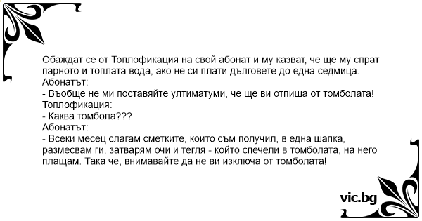 - Всеки месец слагам сметките, които съм получил, в една шапка, размесвам ги, затварям очи и тегля - който спечели в томболата, на него плащам. Така че, внимавайте да не ви изключа от томболата!