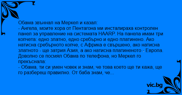 - Ангела, моите хора от Пентагона ми инсталираха контролен панел за управление на системата HAARP. На панела имам три копчета: едно златно, едно сребърно и едно платинено. Ако натисна сребърното копче, с Африка е свършено, ако натисна златното - ще затрия Азия, a ако натисна платиненото - Европа. Доволно се посмял Обама по телефона, но Меркел го прекъснала: