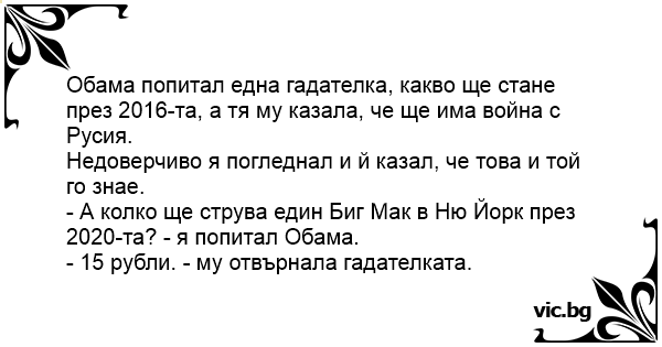 - А колко ще струва един Биг Мак в Ню Йорк през 2020-та? - я попитал Обама.