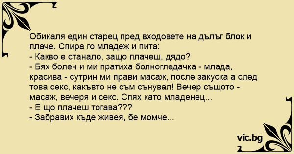 - Бях болен и ми пратиха болногледачка - млада, красива - сутрин ми прави масаж, после закуска а след това cekc, какъвто не съм сънувал! Вечер същото - масаж, вечеря и cekc. Спях като младенец...