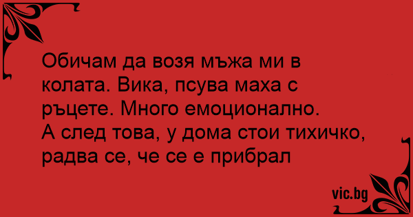 Обичам да возя мъжа ми в колата. Вика, псува маха с ръцете. Много емоционално.