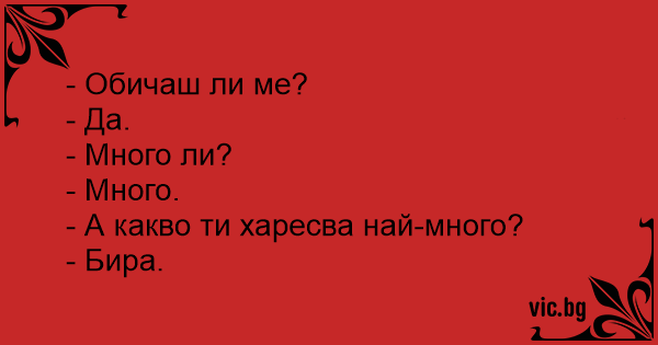 — Ти мене любиш? — Так. — Сильно-сильно? — Так. — А що ти любиш найбільше? — Пиво.