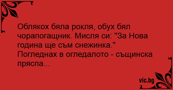 Облякох бяла рокля, обух бял чорапогащник. Мисля си: "За Нова година ще съм снежинка." Погледнах в огледалото - същинска пряспа...