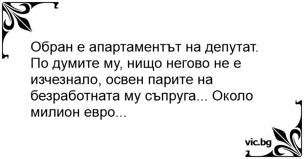 Обран е апартаментът на депутат. По думите му, нищо негово не е изчезнало, освен парите на безработната му съпруга... Около милион евро...