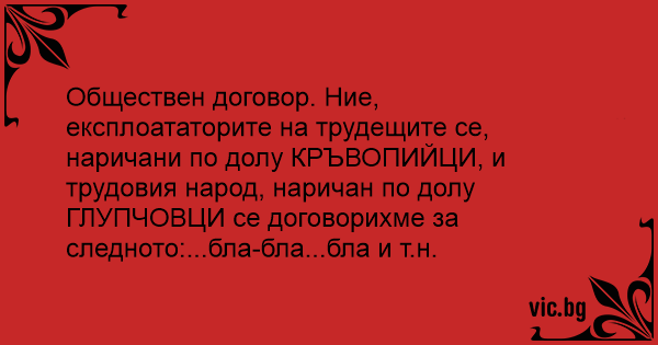 Обществен договор. Ние, експлоататорите на трудещите се, наричани по долу КРЪВОПИЙЦИ, и трудовия народ, наричан по долу ГЛУПЧОВЦИ се договорихме за следното:...бла-бла...бла и т.н.