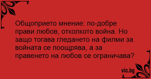 Общоприето мнение: по-добре прави любов, отколкото война. Но защо тогава гледането на филми за войната се поощрява, а за правенето на любов се ограничава?