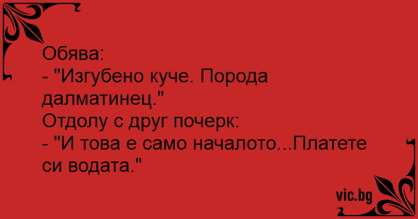 - "Изгубено куче. Порода далматинец."