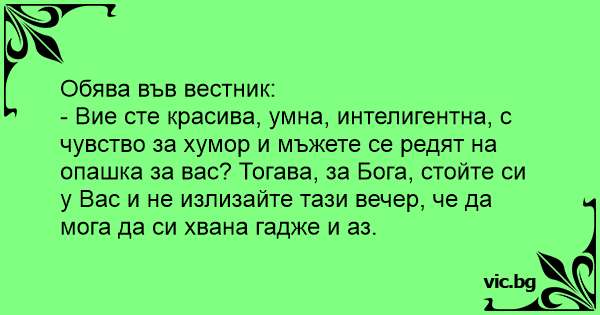- Вие сте красива, умна, интелигентна, с чувство за хумор и мъжете се редят на опашка за вас? Тогава, за Бога, стойте си у Вас и не излизайте тази вечер, че да мога да си хвана гадже и аз.