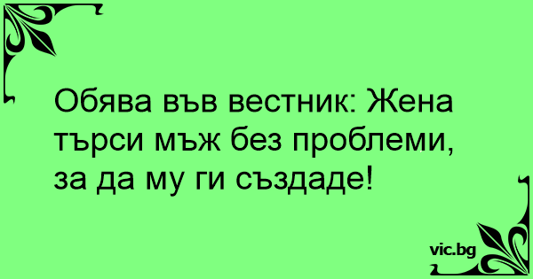 Обява във вестник: Жена търси мъж без проблеми, за да му ги създаде!
