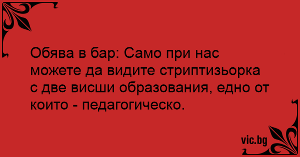 Обява в бар: Само при нас можете да видите стриптизьорка с две висши образования, едно от които - педагогическо.