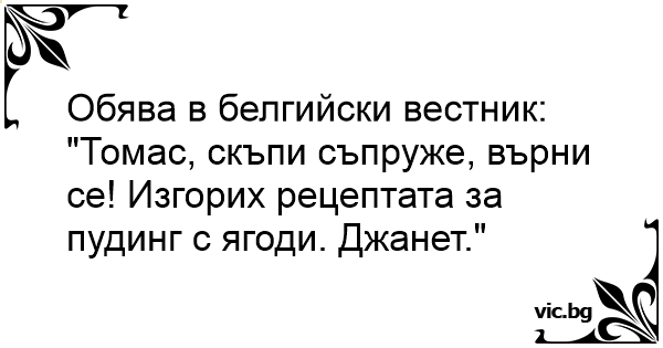 "Томас, скъпи съпруже, върни се! Изгорих рецептата за пудинг с ягоди. Джанет."