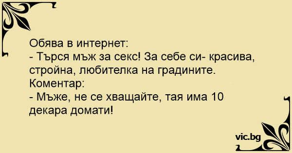 - Търся мъж за cekc! За себе си- красива, стройна, любителка на градините.