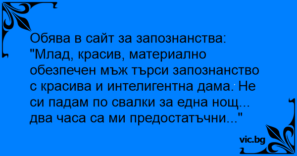 "Млад, красив, материално обезпечен мъж търси запознанство с красива и интелигентна дама. Не си падам по свалки за една нощ... два часа са ми предостатъчни..."