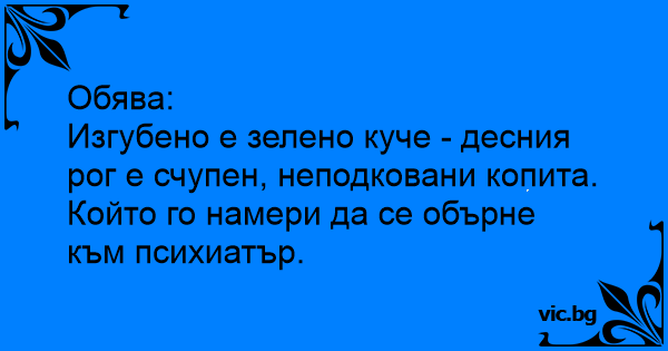 Изгубено е зелено куче - десния рог е счупен, неподковани копита. Който го намери да се обърне към психиатър.
