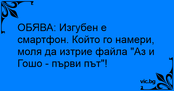 ОБЯВА: Изгубен е смартфон. Който го намери, моля да изтрие файла "Аз и Гошо - първи път"!