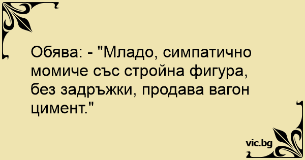Обява: - "Младо, симпатично момиче със стройна фигура, без задръжки, продава вагон цимент."
