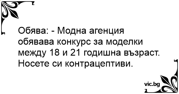 Обява: - Модна агенция обявава конкурс за моделки между 18 и 21 годишна възраст. Носете си контрацептиви.