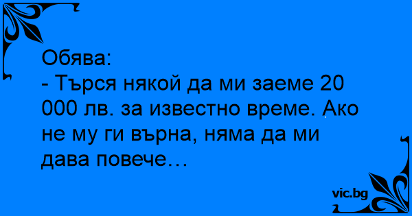 - Търся някой да ми заеме 20 000 лв. за известно време. Ако не му ги върна, няма да ми дава повече…