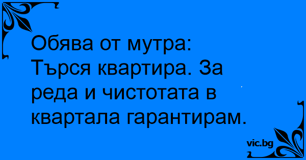 Търся квартира. За реда и чистотата в квартала гарантирам.