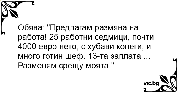 Обява: "Предлагам размяна на работа! 25 работни седмици, почти 4000 евро нето, с хубави колеги, и много готин шеф. 13-та заплата ... Разменям срещу моята."