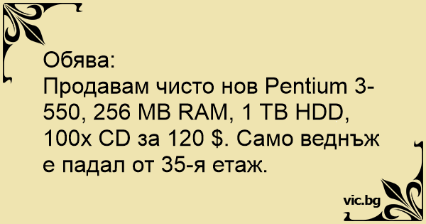 Продавам чисто нов Pentium 3-550, 256 MB RAM, 1 TB HDD, 100x CD за 120 $. Само веднъж е падал от 35-я етаж.