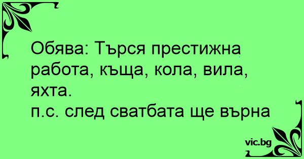 Обява: Търся престижна работа, къща, кола, вила, яхта.