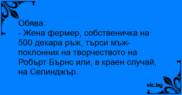 - Жена фермер, собственичка на 500 декара ръж, търси мъж-поклонник на творчеството на Робърт Бърнс или, в краен случай, на Селинджър.