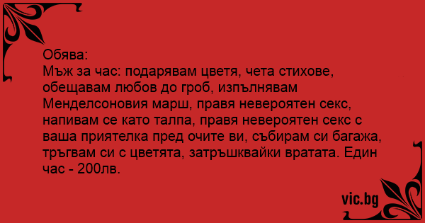 Мъж за час: подарявам цветя, чета стихове, обещавам любов до гроб, изпълнявам Менделсоновия марш, правя невероятен cekc, напивам се като талпа, правя невероятен cekc с ваша приятелка пред очите ви, събирам си багажа, тръгвам си с цветята, затръшквайки вратата. Един час - 200лв.