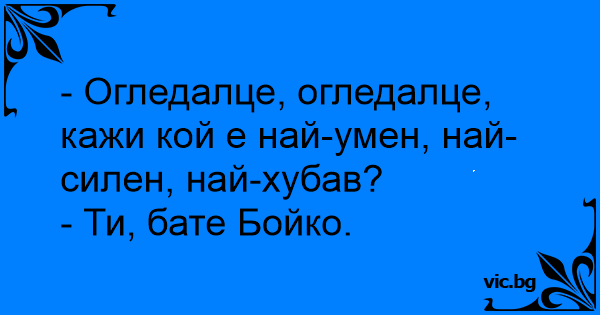 - Огледалце, огледалце, кажи кой е най-умен, най-силен, най-хубав?