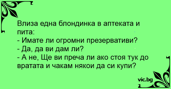 Intră o fată drăguţă la farmacie şi întreabă: - Aveţi prezervative foarte mari de vânzare? - Desigur că avem, vreţi să cumpăraţi? - Nu, dar vă supăraţi dacă am să aştept aici până intră cineva să...