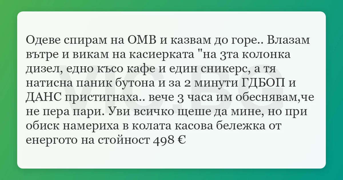 Одеве спирам на ОМВ и казвам до горе.. Влазам вътре и викам на касиерката "на 3та колонка дизел, едно късо кафе и един сникерс, а тя натисна паник бутона и за 2 минути ГДБОП и ДАНС пристигнаха.. вече 3 часа им обеснявам,че не пера пари. Уви всичко щеше да мине, но при обиск намериха в колата касова бележка от енергото на стойност 498 €