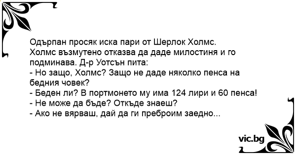 - Но защо, Холмс? Защо не даде няколко пенса на бедния човек?