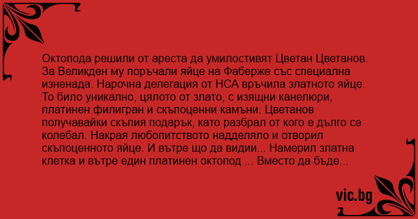 За Великден му поръчали яйце на Фаберже със специална изненада. Нарочна делегация от НСА връчила златното яйце. То било уникално, цялото от злато, с изящни канелюри, платинен филигран и скъпоценни камъни. Цветанов получавайки скъпия подарък, като разбрал от кого е дълго се колебал. Накрая любопитството надделяло и отворил скъпоценното яйце. И вътре що да видии... Намерил златна клетка и вътре един платинен октопод ... Вместо да бъде умилостивен Цветанов съвсем побесял и веднага вдигнал на крак прокуратурата. Наредил веднага да повдигнат обвинение срещу октопода и Фаберже за нарушените му авторски права ...