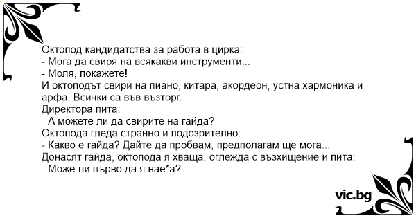 Донасят гайда, октопода я хваща, оглежда с възхищение и пита: