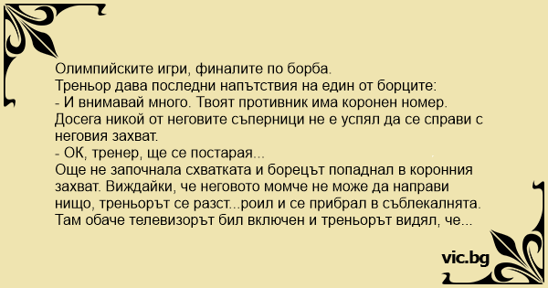 Още не започнала схватката и борецът попаднал в коронния захват. Виждайки, че неговото момче не може да направи нищо, треньорът се разст...роил и се прибрал в съблекалнята. Там обаче телевизорът бил включен и треньорът видял, че публиката, станала на крака, аплодира неговия състезател. След награждаването треньорът пита: