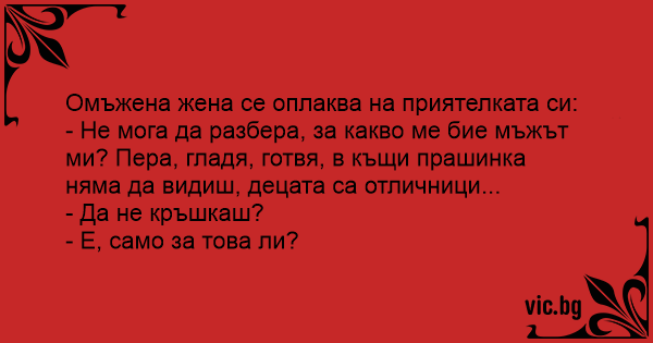 - Не мога да разбера, за какво ме бие мъжът ми? Пера, гладя, готвя, в къщи прашинка няма да видиш, децата са отличници...