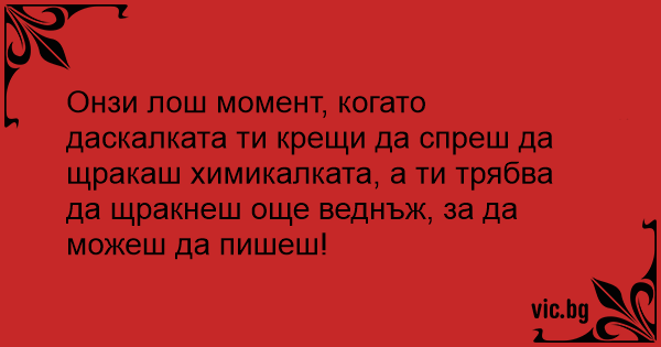 Онзи лош момент, когато даскалката ти крещи да спреш да щракаш химикалката, а ти трябва да щракнеш още веднъж, за да можеш да пишеш!