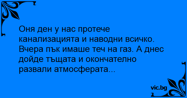 Вчера пък имаше теч на газ. А днес дойде тъщата и окончателно развали атмосферата...