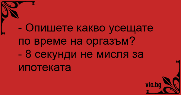 - Опишите ваши ощущения от оргазма. - 8 секунд не думаю об ипотеке.