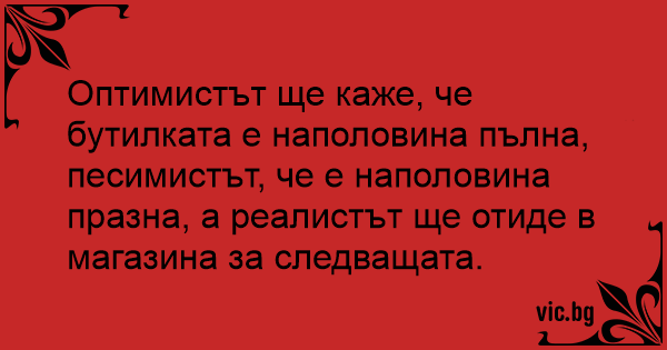 Оптимистът ще каже, че бутилката е наполовина пълна, песимистът, че е наполовина празна, а реалистът ще отиде в магазина за следващата.