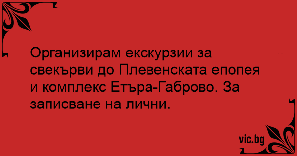 Организирам екскурзии за свекърви до Плевенската епопея и комплекс Етъра-Габрово. За записване на лични.