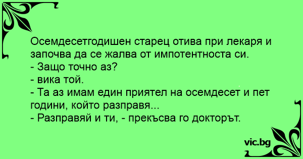 Осемдесетгодишен старец отива при лекаря и започва да се жалва от импотентноста си.