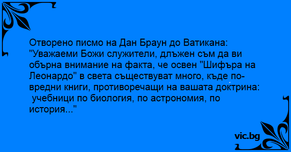 "Уважаеми Божи служители, длъжен съм да ви обърна внимание на факта, че освен "Шифъра на Леонардо" в света съществуват много, къде по-вредни книги, противоречащи на вашата доктрина: