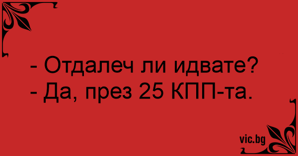 - Отдалеч ли идвате?<br />- Да, през 25 КПП-та.