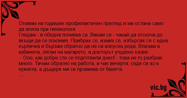 Отивам на годишен профилактичен преглед и ми остана само да вляза при гинеколога.