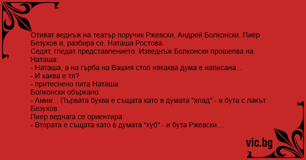 Отиват веднъж на театър поручик Ржевски, Андрей Болконски, Пиер Безухов и, разбира се, Наташа Ростова.
